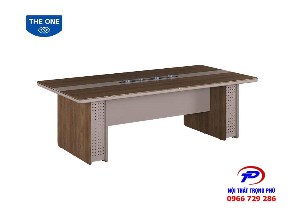 Phần chân bàn dạng hộp trang trí lỗ tròn không chỉ tạo điểm nhấn thẩm mỹ mà còn đảm bảo kết cấu vững chắc, khả năng chịu lực tốt, đáp ứng cường độ sử dụng cao trong môi trường doanh nghiệp. Với kích thước W2400 x D1200 x H760 mm, bàn phù hợp cho các cuộc họp từ 8–10 người, tối ưu không gian phòng họp vừa và lớn.