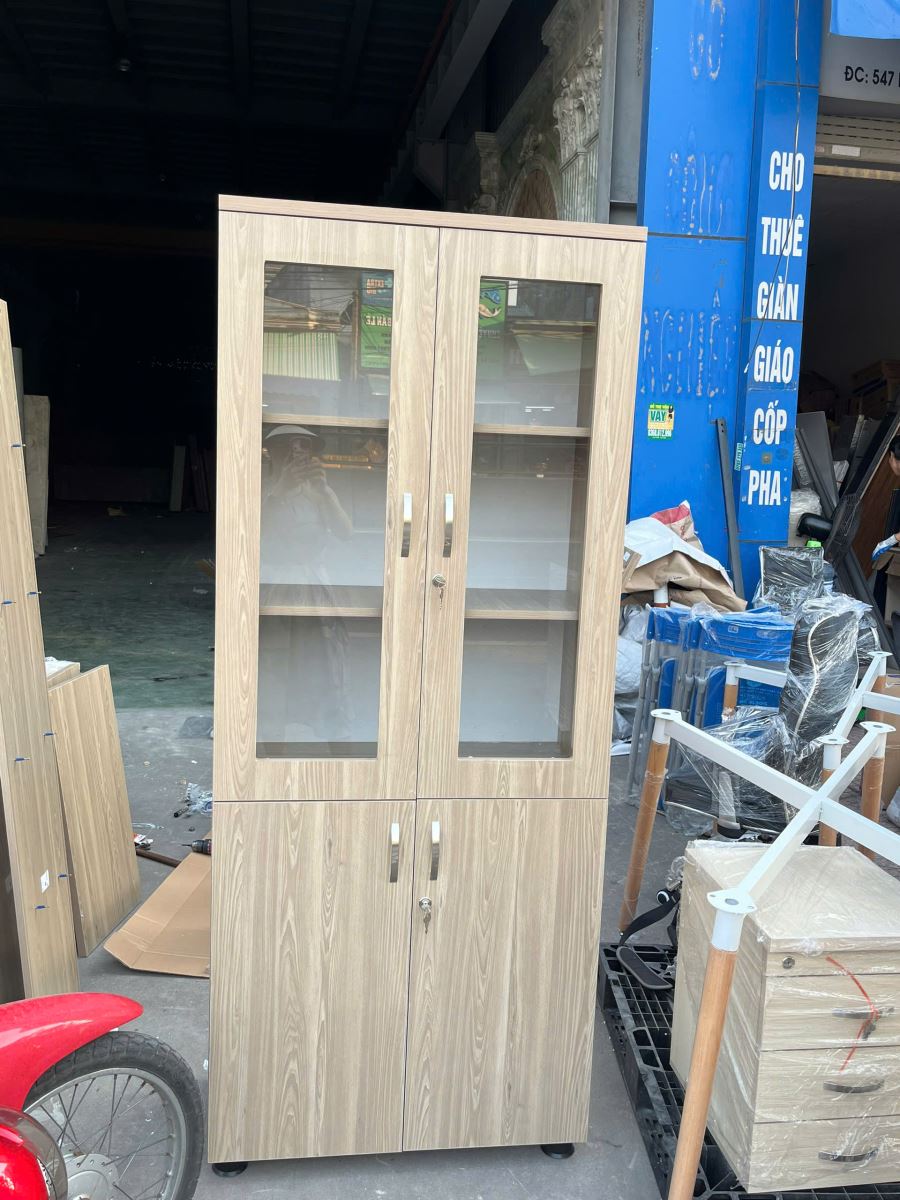 Phần trên sử dụng 2 cánh khung kính trong, giúp dễ dàng quan sát tài liệu, sách, hồ sơ thường xuyên sử dụng. Phần dưới là 2 cánh mở bằng gỗ kín có khóa, phù hợp để lưu trữ hồ sơ quan trọng, giấy tờ nội bộ hoặc đồ cá nhân, đảm bảo tính riêng tư và an toàn.